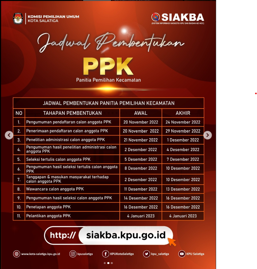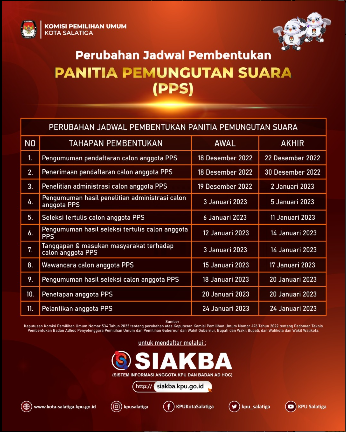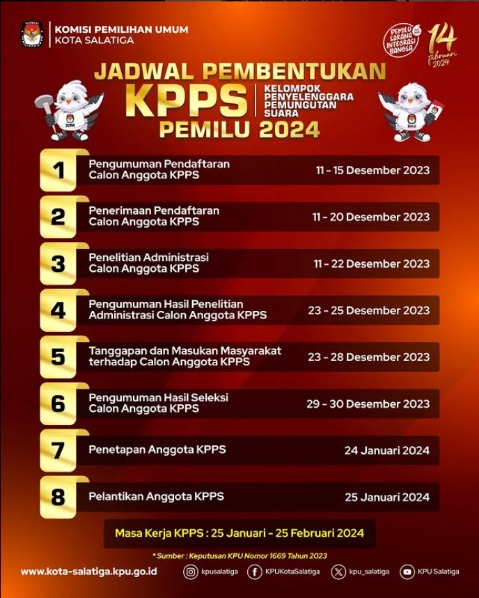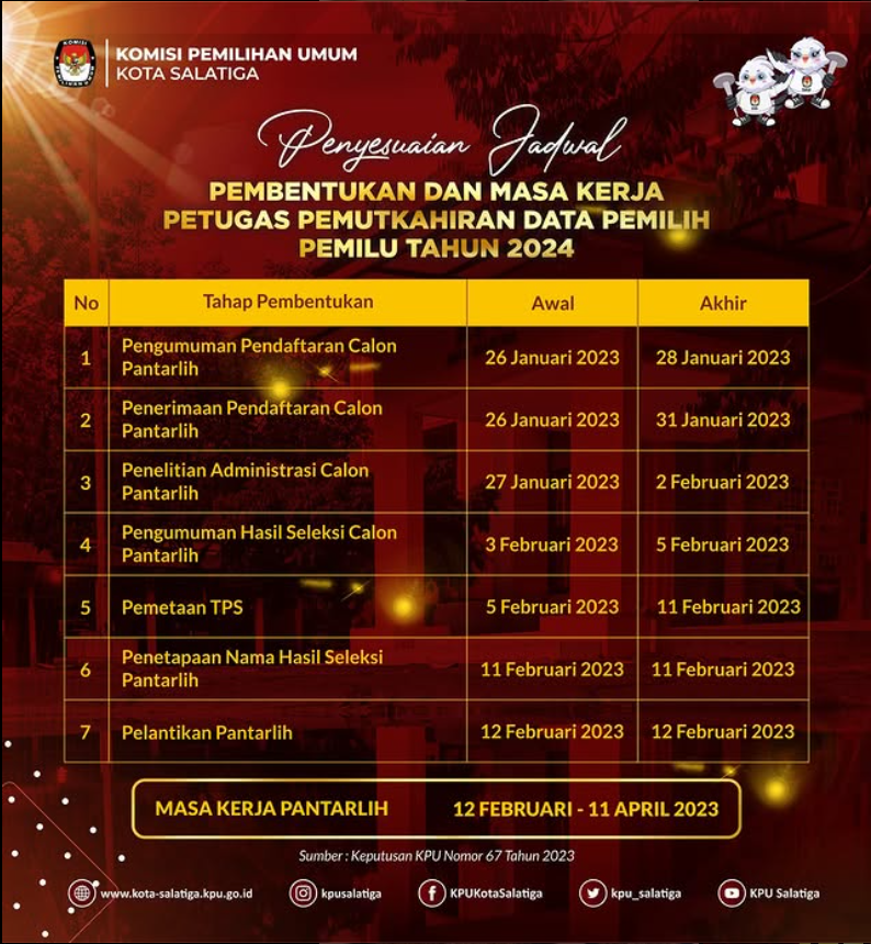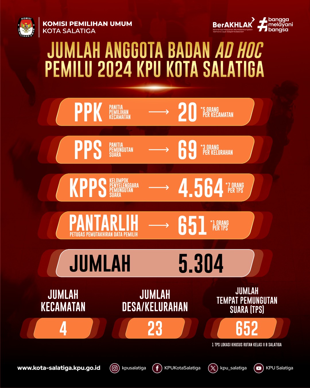 Dalam rangka mendukung pelaksanaan Pemilihan Umum Tahun 2024, KPU Kota Salatiga melaksanakan pembentukan badan Ad Hoc yang terdiri dari PPK, PPS, Pantarlih dan KPPS.